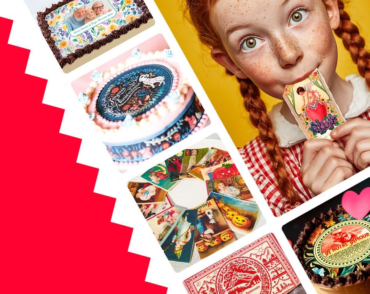 Inspirés par le charme rétro et la finesse graphique du début du 20e siècle, nos "papiers-bonbon" sont des feuilles comestibles en sucre ou azyme imprimées avec des images venues d’un autre temps.