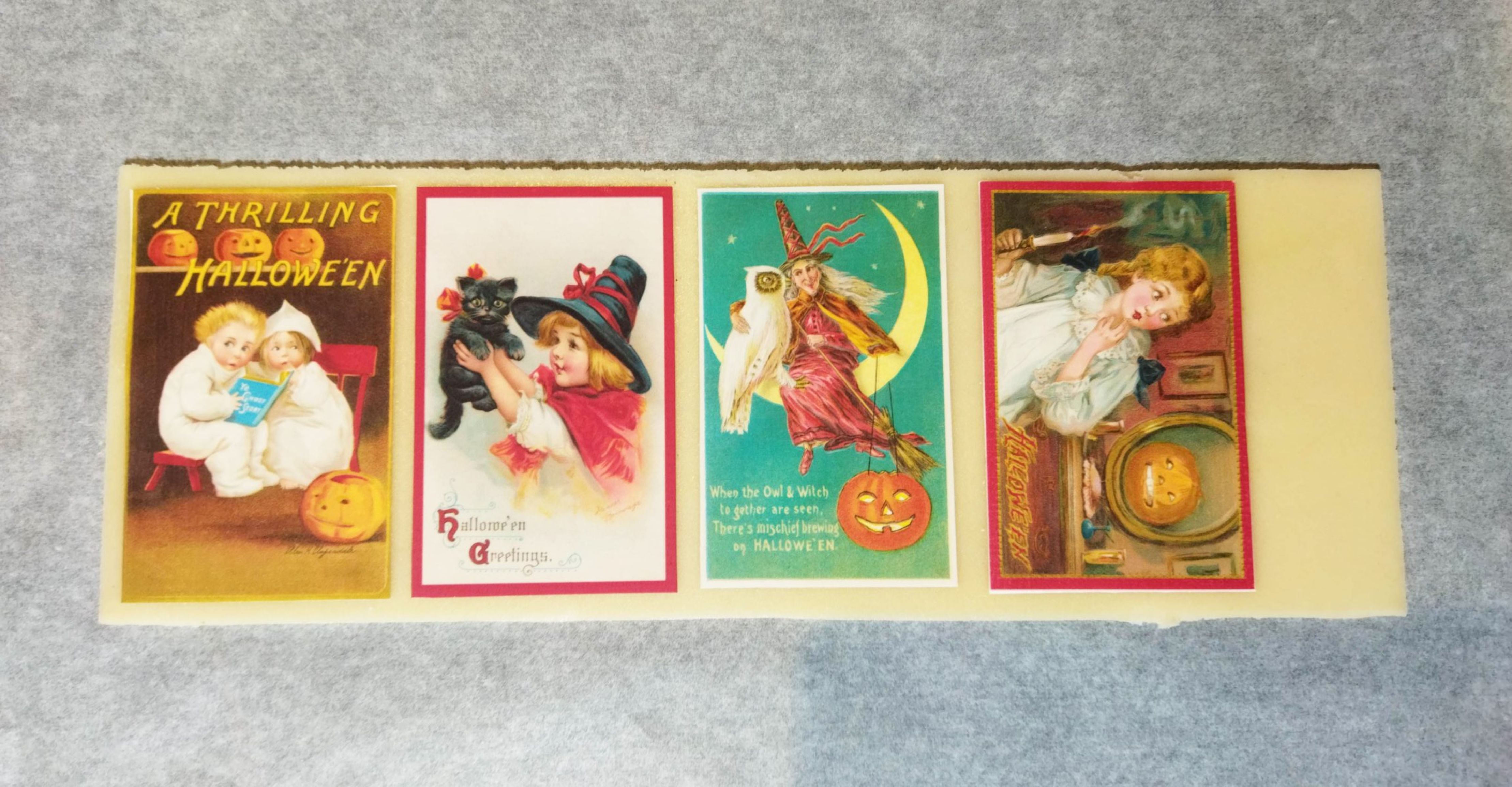 7/ Retournez délicatement l’ensemble puis placez la moitié des cartes imprimées (4 cartes) sur le dessus.